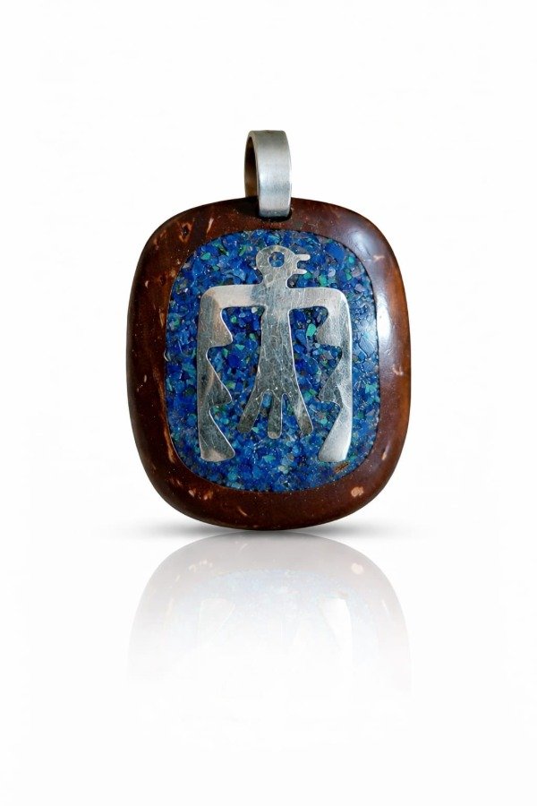 Dije para collar de diseño en coco seco y calado alpaca, realizado a mano con reconstituido de mix de piedras Malaquita y Lapislázuli. Enganche de coco seco (ideal para personas con alergia al metal).
